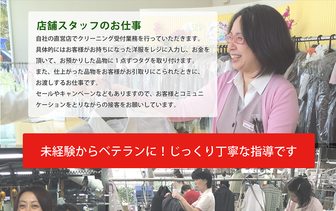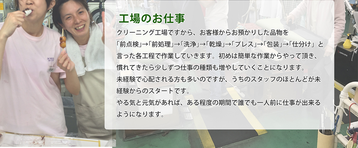クリーニングの仕事ですので、お店から配送されたお洋服を仕分け、検品、前処理、洗浄(ドライクリーニング、水洗い)、仕上げ
